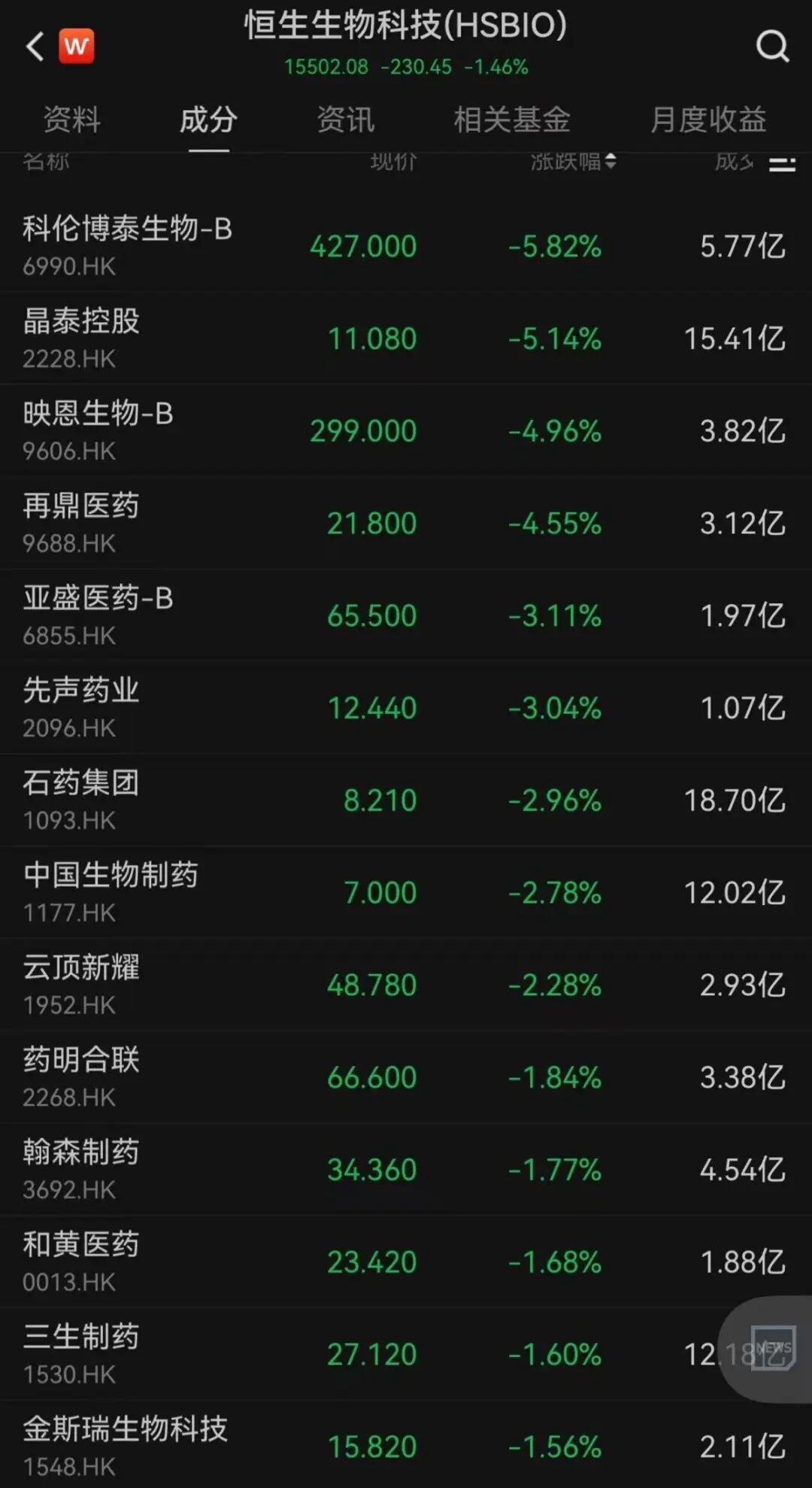 恒生生物科技指数今日下跌1.46%,30只成份股中,25只收跌。B类股科伦博泰生物、映恩生物、亚盛医药分别下跌5.82%、4.96%、3.11%,晶泰控股、再鼎医药和石药集团等均下跌。