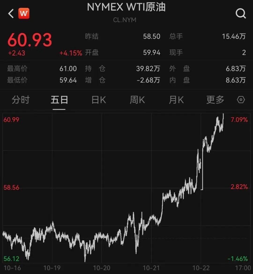 10月22日,NYMEX WTI原油价格大幅拉升,涨超3%;10月23日,亚盘交易时段继续上涨。
