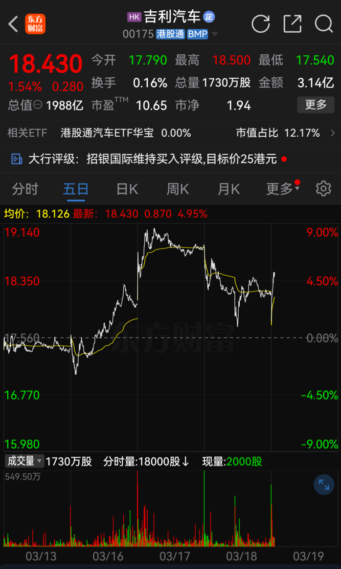 3月19日开盘,吉利汽车涨幅超1.5%,总市值一度逼近2000亿港元。消息面上,3月18日晚间,吉利汽车在NVIDIA GTC 2026大会上宣布,将与英伟达在物理AI、企业AI、工业AI等三大领域持续深化合作与战略协同。吉利汽车正在持续凸显科技属性。同一天,吉利汽车召开2025年全年业绩发布会,明确将全面加速AI科技化,赋能产品智能体验的突破式提升,向实现“全球智能汽车引领者”的目标迈进。“与英伟达的合作,将对吉利汽车的智能化发展起到非常好的促进作用。”吉利汽车行政总裁及执行董事桂生悦表示,吉利汽车的科技属性确认后,相信资本市场很快会对其估值有一个根本性转变。与英伟达深化AI合作