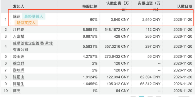 从背景来看,陈运并非资本市场新面孔。他曾是上市公司合力泰、三利谱的联合创始人,现任胜宝莱光电科技有限公司(以下简称胜宝莱)创始人、董事长、总经理,并直接持有该公司60%股权。