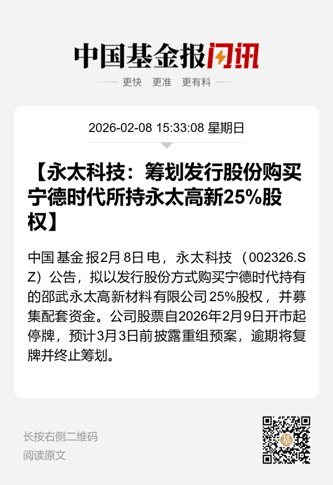 【导读】永太科技将获宁德时代入股,计划2月9日停牌前涨停
