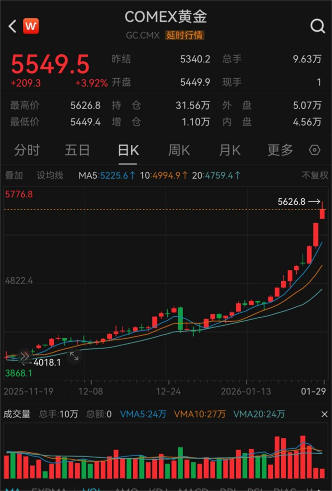 1月29日,国际金价再次大幅上涨,现货、期货双双站上5500美元/盎司,其中,黄金期货一度突破5600美元/盎司关口。截至发稿,COMEX黄金报5549.5美元/盎司,上涨3.92%;伦敦金报5528.377美元/盎司,上涨2.04%。