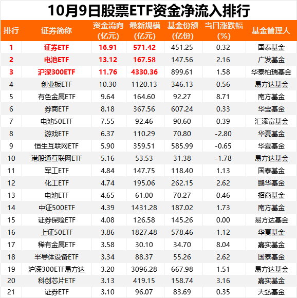 从单只产品看,证券ETF净流入16.91亿元,位居单日资金净流入榜首位;电池ETF、沪深300ETF、创业板ETF净流入资金均超10亿元,分别位列第二至第四位。