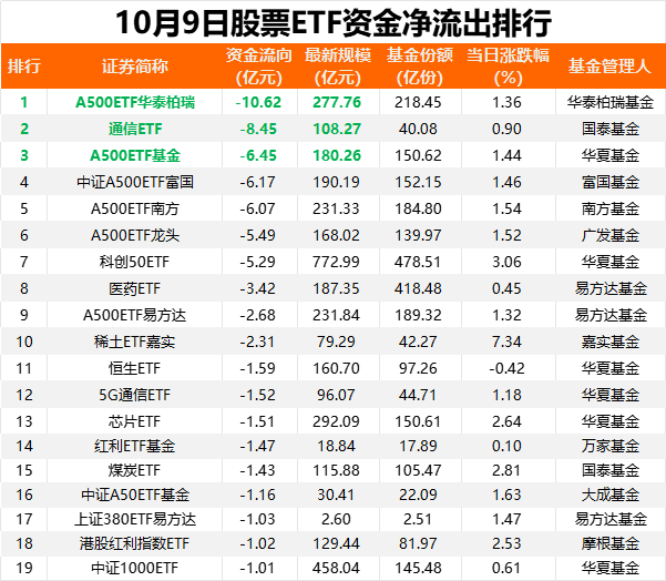 从净流出方向看,中证A500指数ETF单日净流出居前,达38.85亿元;此外,通信、科创板50指数、港股宽基、红利等指数ETF净流出也较多。