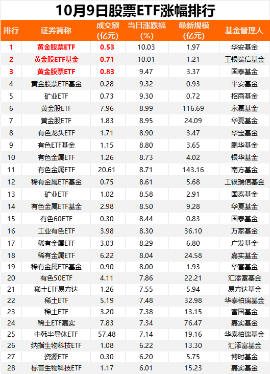 从股票ETF二级市场表现看,金价再创历史新高,华安基金黄金股票ETF、工银瑞信基金黄金股ETF基金尾盘涨停,国泰基金黄金股票ETF、平安基金黄金股票ETF基金涨超9%。有色板块跟随市场上扬,招商基金矿业ETF、华宝基金有色龙头ETF分别涨9.3%、8.9%。