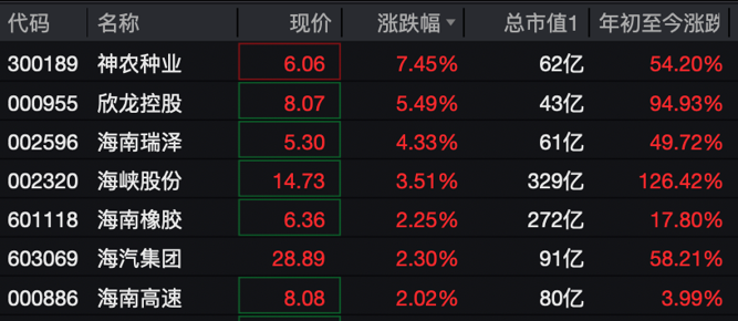 个股方面,海南海药、海马汽车封板涨停,康芝药业、神农种业、欣龙控股等多股涨超5%,*ST双城等跟涨。