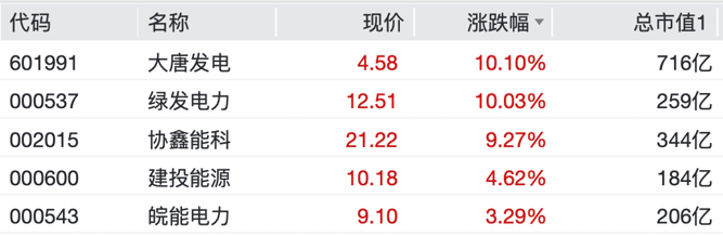 个股方面,绿发电力、华电能源录得3连板,大唐发电、节能风电涨停,协鑫能科涨超9%。