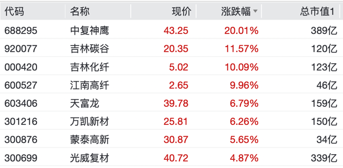 宝丰能源涨逾6%,三房巷一字涨停,中复神鹰录得20cm涨停,皖维高新、吉林化纤、江南高纤均录得10cm涨停。