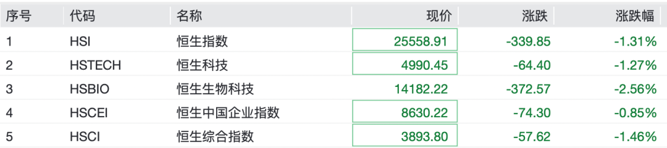 港股市场同步下挫。截至发稿,恒生指数跌1.31%,恒生科技指数跌1.27%,恒生生物科技指数跌2.56%。个股方面,腾讯控股跌超1%,阿里巴巴跌逾2%,比亚迪、美的集团、小米集团纷纷下跌。