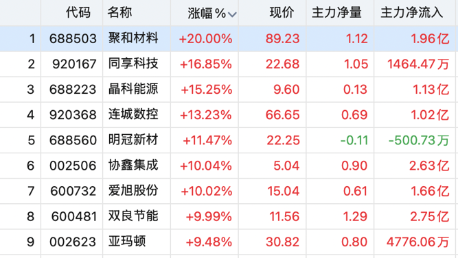 光伏板块开盘暴涨,聚合材料录得20cm涨停,协鑫集成、爱旭股份、双良节能均录得10cm涨停,晶科能源大涨15%,同享科技、连城数控、明冠新材均涨超10%。