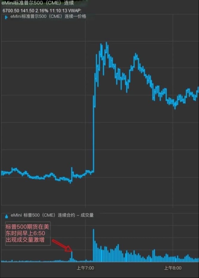 在同一时间点——6点50分前27秒,在油市交易发生后不久,追踪标普500指数的期货价格迅速上涨,同时成交量也明显放大。