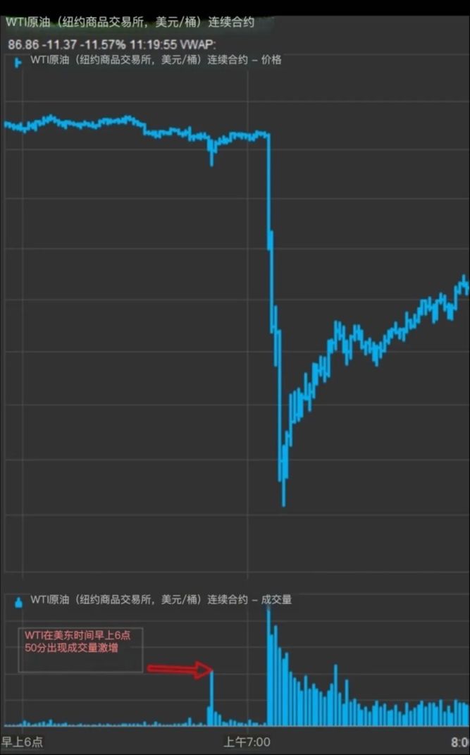 分析师称,6点49分起的两分钟内,至少对应600万桶布伦特和西德州中质原油的期货被卖出。而在此前五个交易日的同一时间段,平均成交量仅约700手(约70万桶)。特朗普在Truth Social上的发帖时间大约是7点05分。