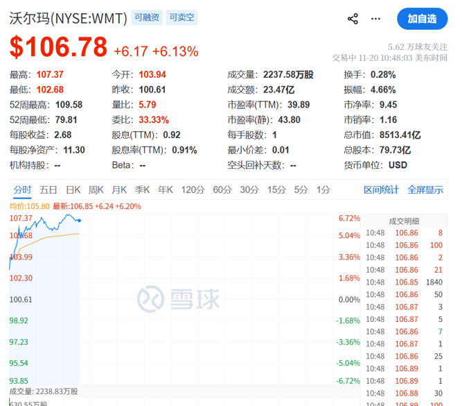 此外,沃尔玛股价上涨超6%,此前其公布的财报显示第三季度销售和营收均好于市场预期,部分动力来自电商业务的持续增长。