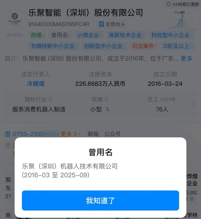 记者注意到,今年9月,乐聚机器人发生市场主体类型变更,从有限责任公司变更为股份有限公司(非上市、自然人投资或控股),工商注册名称也从乐聚(深圳)机器人技术有限公司变更为乐聚智能(深圳)股份有限公司。