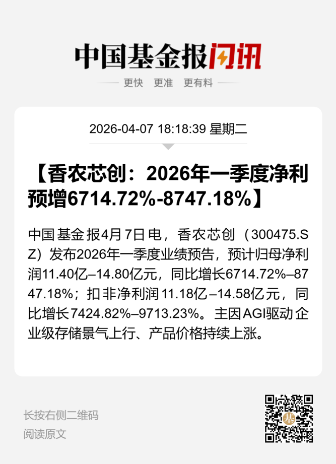 4月7日晚间,香农芯创发布业绩预告称,2026年第一季度,公司预计归母净利润同比增长6714.72%至8747.18%,扣非后净利润同比增长7424.82%至9713.23%。