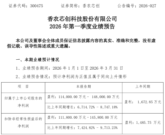 业绩预告显示,香农芯创预计其2026年第一季度的归母净利润为11.40亿元至14.80亿元,扣非后净利润为11.18亿元至14.58亿元。