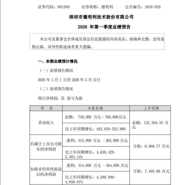 德明利4月1日发布公告称,预计2026年第一季度归母净利润为31.50亿元至36.50亿元,同比增长4659.62%至5383.14%。