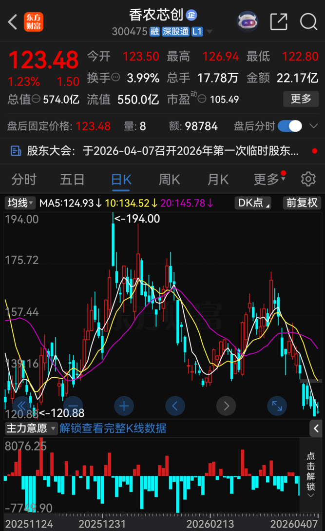 截至4月7日收盘,香农芯创股价报123.48元/股,涨幅达1.23%,总市值为574亿元。