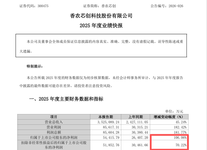 4月7日晚间,香农芯创披露业绩快报称,公司2025年度归母净利润为5.44亿元,同比增长106.06%;扣非后净利润为5.19亿元,同比增长70.22%。
