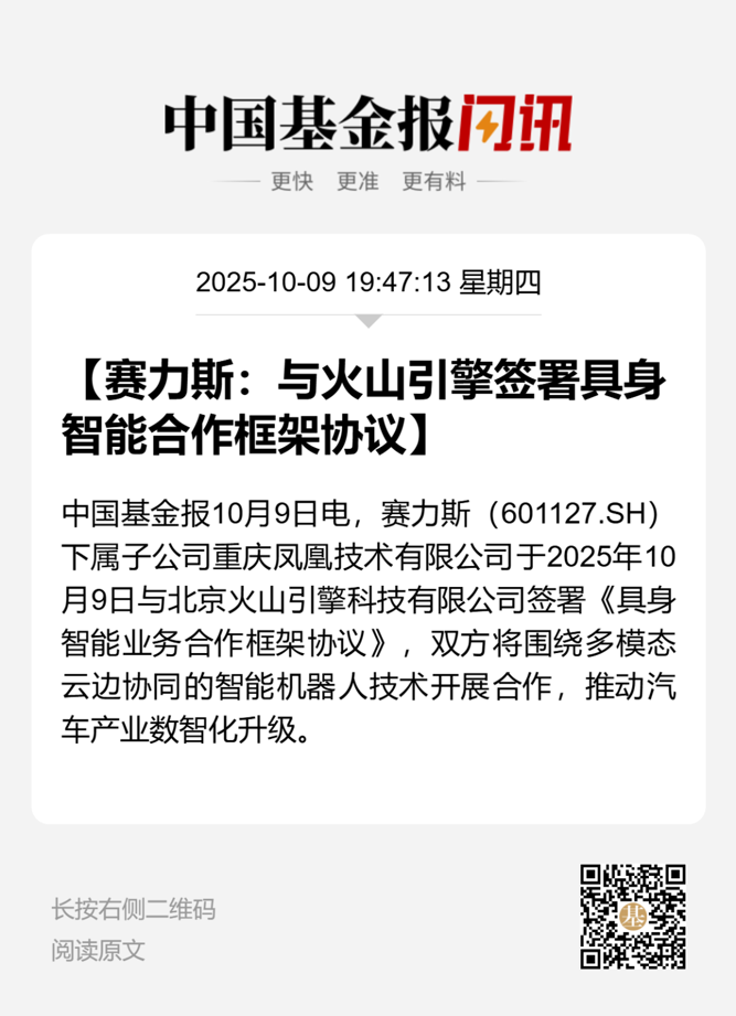 10月9日,赛力斯子公司重庆凤凰技术有限公司(以下简称赛力斯凤凰)与北京火山引擎科技有限公司(以下简称火山引擎)签署《具身智能业务合作框架协议》。