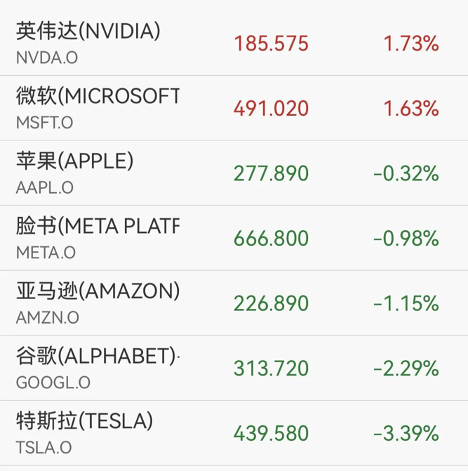 盘面上,大型科技股大多下跌,谷歌A跌2.29%,亚马逊跌1.15%,Meta跌0.98%,苹果跌0.32%,而微软收涨1.63%,英伟达涨1.73%。