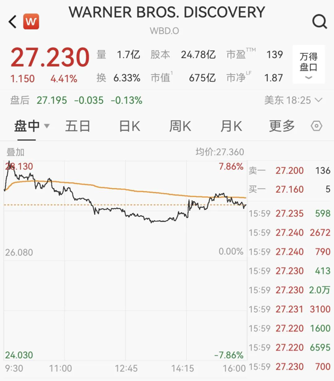 截至收盘,奈飞大跌3.41%,报96.82美元/股,最新总市值为4102亿美元。华纳兄弟探索公司收涨4.41%,报27.23美元/股。