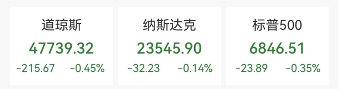 截至收盘,道琼斯工业平均指数收跌215.67点,跌幅为0.45%,报47739.32点。纳斯达克指数收跌32.23点,跌0.14%,报23545.904点。标普500指数收跌23.89点,跌0.35%,报6846.52点。