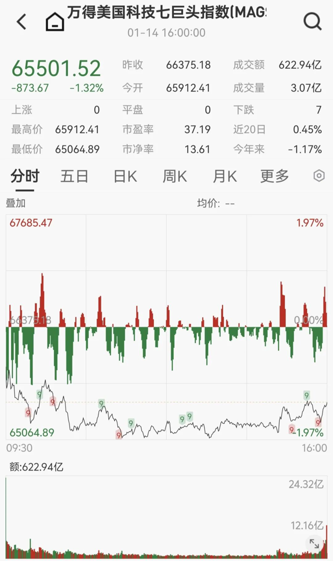 大型科技全线下跌,万得美国科技七巨头指数下跌1.32%。
