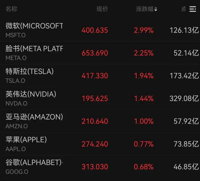 美股科技“七巨头”集体上涨,其中,微软涨近3%,脸书涨2.25%,特斯拉涨1.94%,英伟达涨1.44%,亚马逊涨1%。