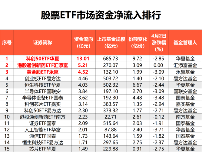 Wind数据显示,截至4月2日,全市场1378只股票ETF(含跨境ETF)总规模达3.75万亿元。在股市下跌行情中,股票ETF市场净流出资金超56亿元。