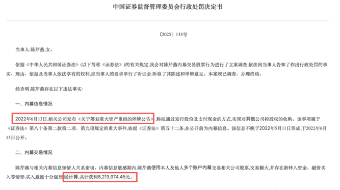 陈芹燕与相关内幕信息知情人关系密切。内幕信息敏感期内,陈芹燕使用本人及他人多个账户内幕交易相关公司股票,交易额大,并存在新转入资金、融资买入等情形,买入意愿十分强烈,经计算,共计获利821万元。证监会决定没收陈芹燕违法所得,并处以4107万元的罚款。