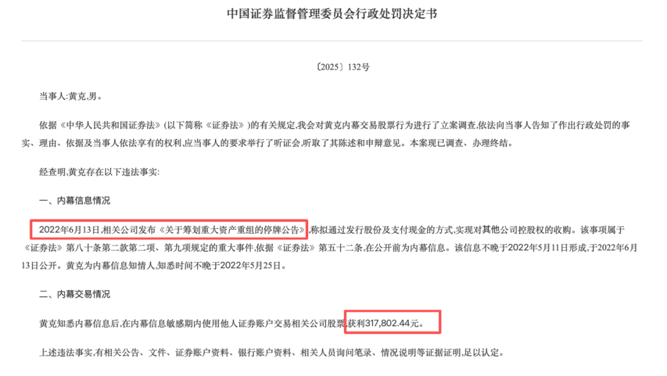 经查明,黄克存在以下违法事实:2022年6月13日,相关公司发布《关于筹划重大资产重组的停牌公告》,称拟通过发行股份及支付现金的方式,实现对其他公司控股权的收购。黄克知悉内幕信息后,在内幕信息敏感期内使用他人证券账户交易相关公司股票,获利31.8万元。黄克的上述行为构成内幕交易行为。证监会决定:没收黄克违法所得31.8万元,并处以150万元罚款。