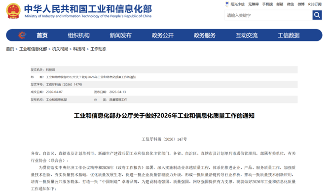 4月13日,工业和信息化部办公厅发布《关于做好2026年工业和信息化质量工作的通知》(以下简称《通知》)。