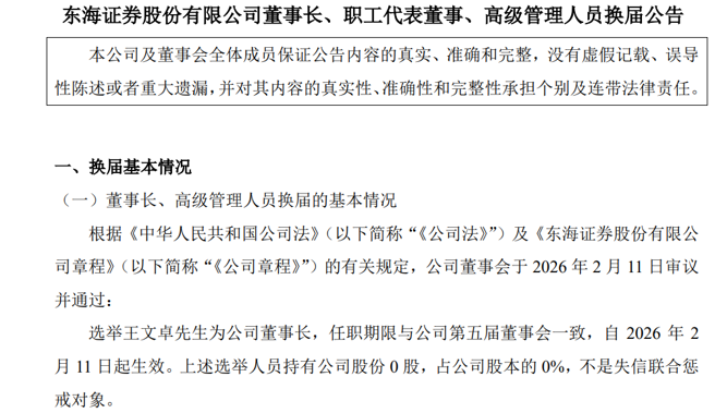 2月11日,东海证券发布公告称,公司董事会于当日审议并通过多项人事变动决议,完成了董事长、职工代表董事及高级管理人员的换届工作。