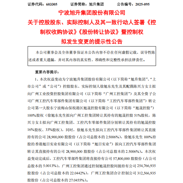 旭升集团公告称,本次权益变动完成后,公司控股股东将由徐旭东变为广州工控集团,实控人将由徐旭东变为广州市人民政府。