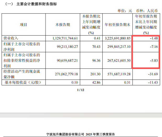 2025年前三季度,旭升集团的营业收入为32.26亿元,同比下降1.48%;归母净利润约为3亿元,同比下降7.16%。