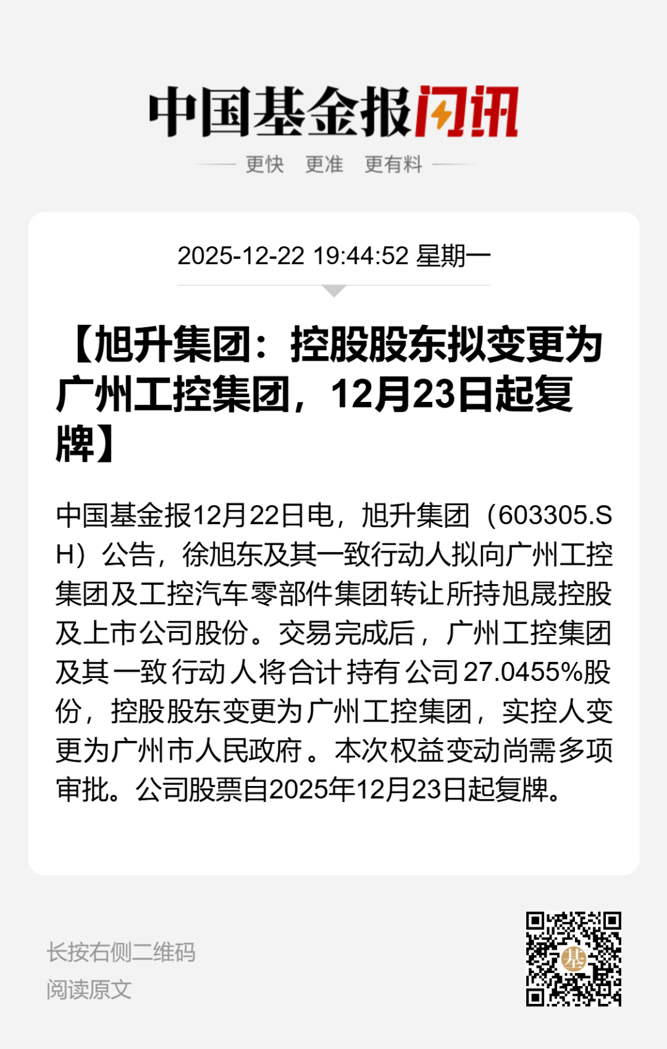 【导读】旭升集团拟易主广州国资,自12月23日开市起复牌