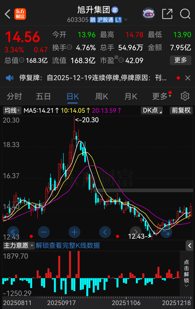 旭升集团自12月19日开市起停牌,计划自12月23日开市起复牌。截至12月18日收盘,旭升集团股价报14.56元/股,总市值达168.3亿元。