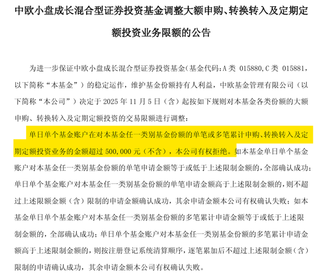 根据公告,中欧小盘成长混合基金自2025年11月5日起暂停50万元以上的大额申购。这是继今年8月14日该基金单日限购1000万元之后的年内第二次限购。