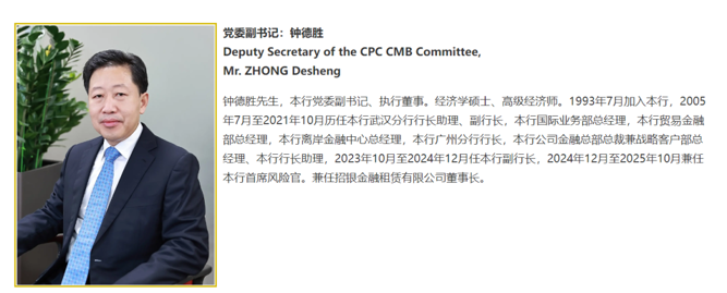 钟德胜在招商银行官网领导层排名仅次于董事长缪建民与行长王良,排名第三;辞任首席风险官前,官网显示的主要职务为党委副书记、首席风险官;最新官网信息显示,钟德胜的职务为党委副书记。