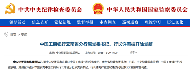 12月29日,中央纪委国家监委官网通报:中国工商银行云南省分行原党委书记、行长许海被开除党籍。