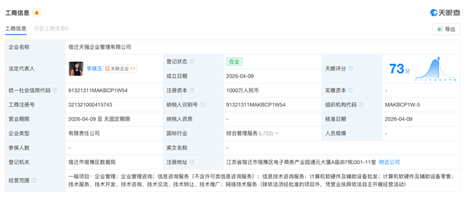 天眼查显示,4月9日,宿迁天强企业管理有限公司成立,公司法定代表人为李瑞玉,注册资本为1000万元,经营范围包括:企业管理;企业管理咨询;信息咨询服务(不含许可类信息咨询服务);信息技术咨询服务;计算机软硬件及辅助设备批发;计算机软硬件及辅助设备零售等。