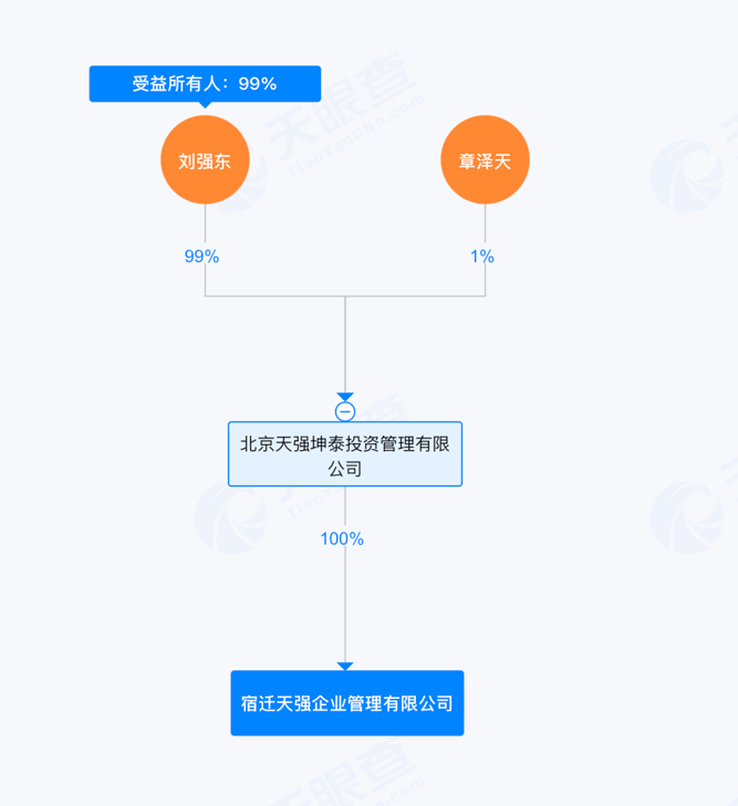 股权穿透显示,宿迁天强企业管理有限公司由北京天强坤泰投资管理有限公司全资持股,后者则由刘强东、章泽天夫妇共同持股。