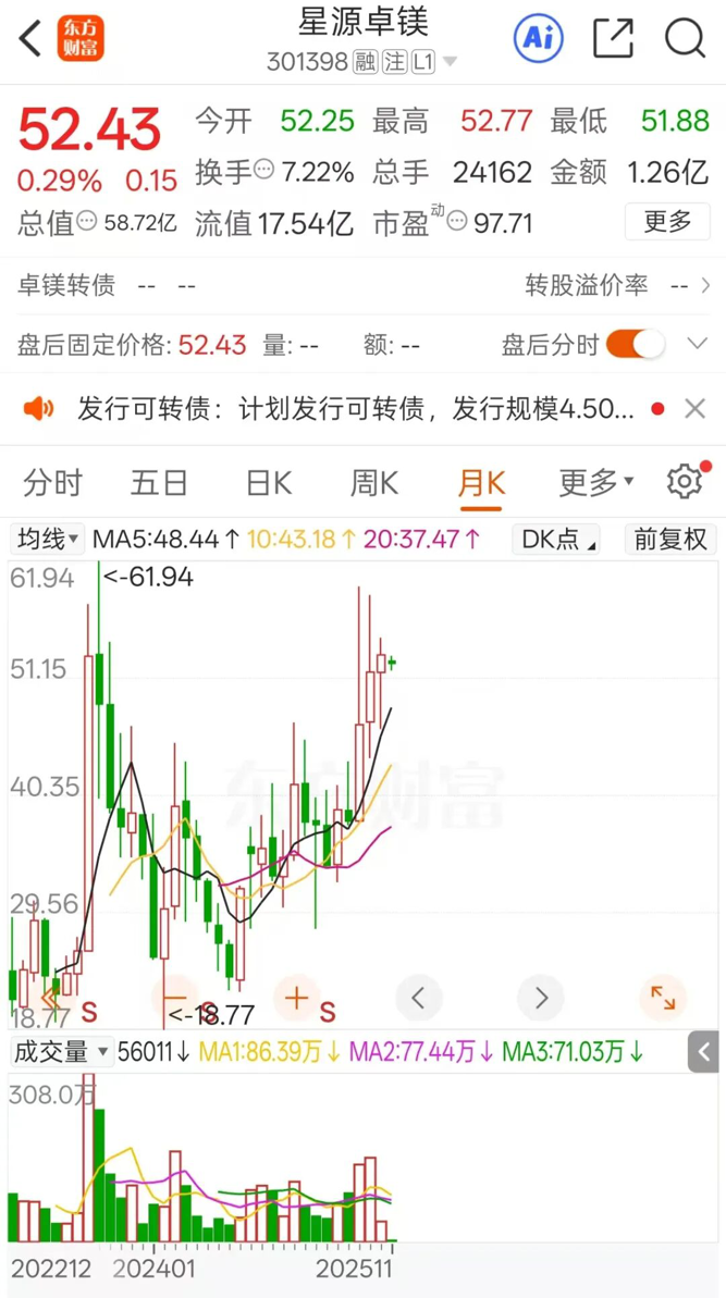 目前公司正在发行规模4.5亿元的可转债,同在11月4日晚还公告了一些发行安排,不知此次超20亿元的定点通知会否让投资人增添几分认购信心?截至11月4日收盘,星源卓镁的市值是58.72亿元。