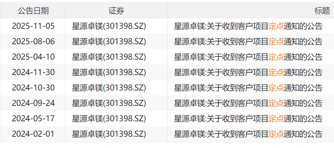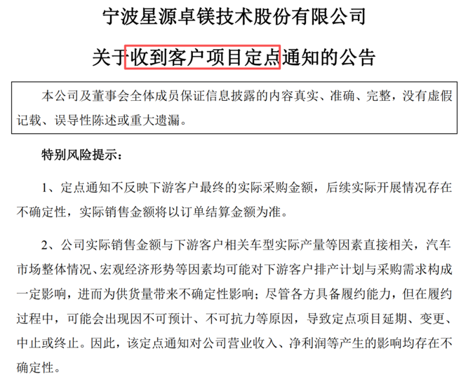 但星源卓镁也在公告中表示,公司实际销售金额与下游客户相关车型实际产量等因素直接相关,汽车市场整体情况、宏观经济形势等因素均可能对下游客户排产计划与采购需求构成一定影响,进而给公司的供货量带来不确定性。因此,该定点通知对公司营业收入、净利润等产生的影响均存在不确定性。