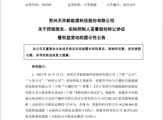 10月31日晚间,天华新能发布公告称,公司实控人裴振华、容建芬夫妇拟通过协议转让方式,向宁德时代合计转让所持12.95%的公司股份,转让价款合计达26.35亿元。