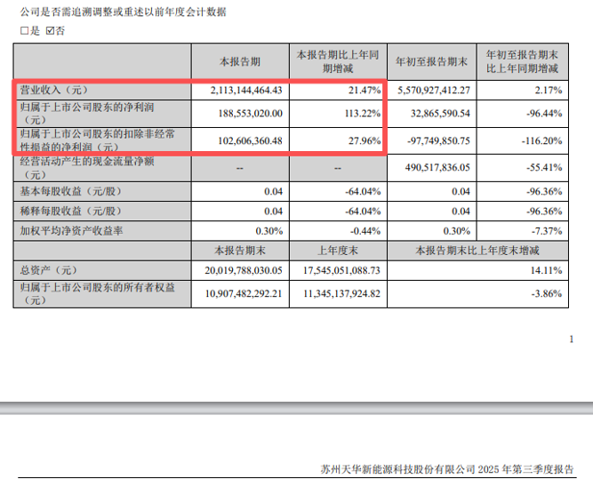 2025年第三季度,天华新能的营业收入同比增长21.47%至21.13亿元,归母净利润同比增长113.22%至1.89亿元。