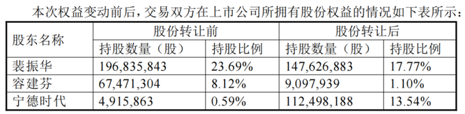 交易完成后,裴振华、容建芬、宁德时代持有天华新能的股份比例,分别为17.77%、1.10%、13.54%。