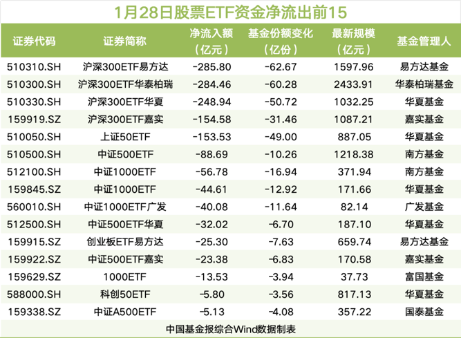 1月28日,宽基ETF资金净流出居前,达1471.86亿元,其中,沪深300指数产品资金净流出达975.3亿元。