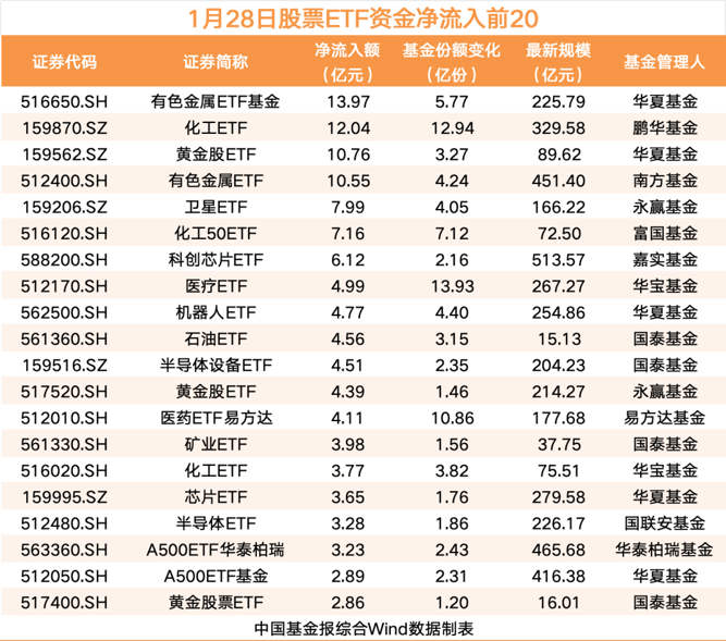 具体来看,1月28日共有53只ETF资金净流入超1亿元。其中,华夏基金的有色金属ETF基金、鹏华基金的化工ETF、华夏基金的黄金股ETF位列前三,资金净流入分别为13.97亿元、12.04亿元、10.76亿元。